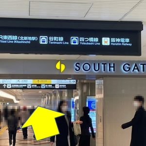 - 降りるとサウスゲートの標識があります。阪神百貨店さんがありますので、そのまま直進してください。